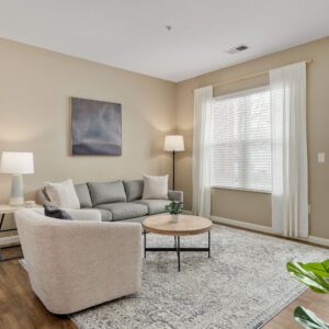 Lovingly decorated and designed for comfort, the living room features a full-size sofa, side chair, cozy lamp lighting, and modern windows that welcome in lots of natural light.